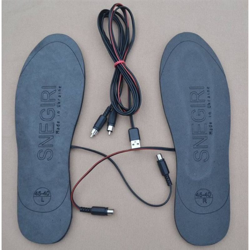 - Комплект: две стельки 45 размера с возможностью подрезки до 40 размера, 2 кабеля, которые объединяются в 1 выход USB.