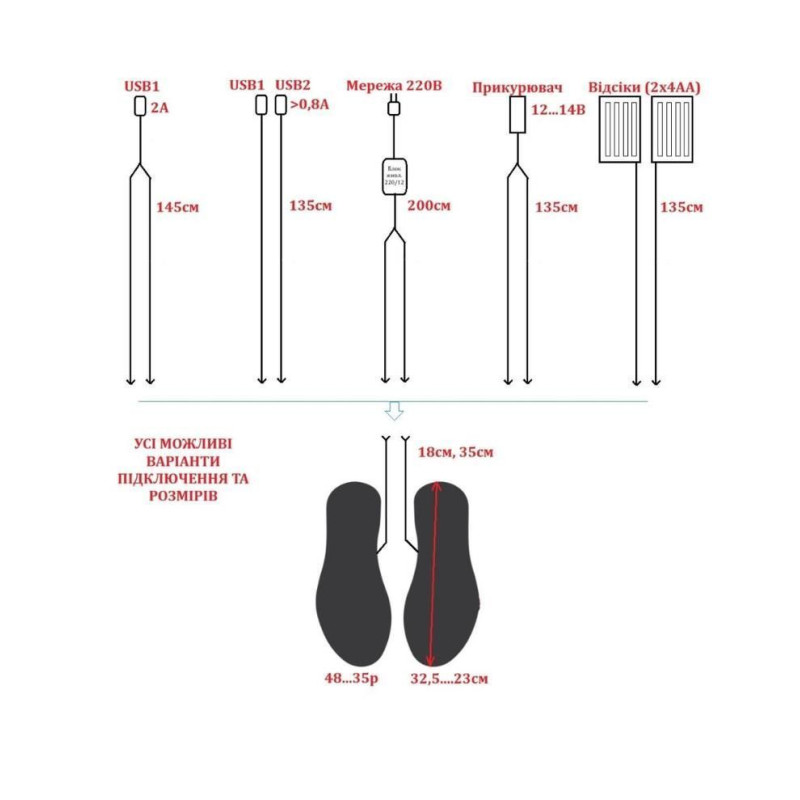 - Длина провода от стельки 18 см + 145 см (кабели USB на один выход).