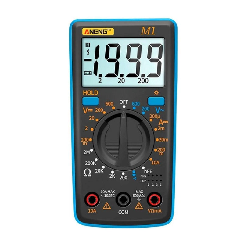 Этот простой в использовании тестер может измерять DC / AC напряжение, DC / AC ток, сопротивление и проверять диоды и транзисторы. Кроме того, он имеет функцию звуковой сигнализации при измерении замыкания и удобный дисплей с подсветкой, чтобы обеспечить четкое отображение результатов в любых условиях. Мультиметр ANENG M1 легкий, компактный и удобный для переноски, что позволяет легко брать его с собой, когда вы отправляетесь в путешествие или выполняете ремонтные работы в других местах. Заменяемый элемент питания позволяет легко заменить батарею, чтобы вы всегда были готовы к работе. ANENG M1 — надежный инструмент для любого электрика или электроника, который обеспечит точные и быстрые результаты измерений.