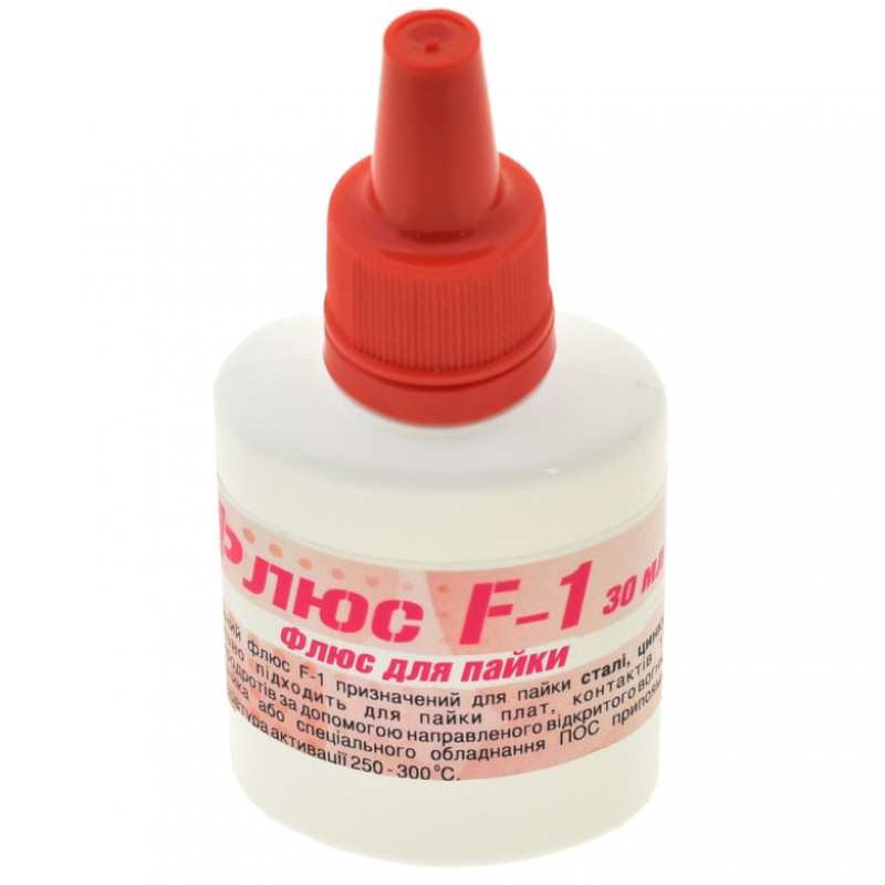 Флюс F1 оставляет после пайки прозрачный и некоррозионный остаток, который обладает изолирующими свойствами. Благодаря этому его можно не смывать после пайки, что упрощает процесс и сокращает время обработки. Остаточное сопротивление между дорожками с шагом 0,5 мм - более 5 МОм. Рабочая температура до 300° С. Флюс имеет не высокую цену и достаточно популярен, но иногда можно столкнуться с продукцией сомнительного качества. Результат от применения такого продукта непредсказуем.