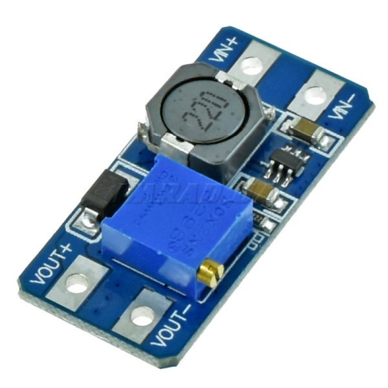 Модуль живлення MT3608 — це модуль підвищувального перетворювача, призначений для невеликих і малопотужних застосунків. Модуль має можливість регулювати вихідну напругу до 28 В і видавати вихідний струм максимум 2 А. Модуль складається з мікросхеми MT3608, яка поставляється в 6-контактному пакеті перемикачів SOT23-6 на частоті 1,2 МГц, що дозволяє використовувати крихітні конденсатори та котушки індуктивності, що веде до компактного розміру модуля підвищення потужності.