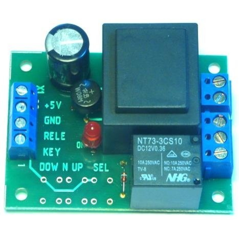 Модуль PSR-12 призначений для живлення від мережі 220В виробів серії 4d56 і керування потужними електроприладами за допомогою встановленого на платі реле 220В-10А. Стан реле індикується світлодіодом. Пристрій забезпечує гальванічну розв’язку між контролером, мережею і може використовуватися з будь-якими автоматизованими пристроями, для яких потрібне живлення +12V. Для програмування виробів серії 4d56 у модулі живлення передбачено встановлення сервісних кнопок керування («Більше», «Менше», «Режим»). Ланцюги підключення модуля, включно з усіма трьома контактами реле для перемикання, виведені на роз'єми з гвинтовими затискачами. Модуль компактний і має малі габарити. Трансформатор і реле – промислової європейської якості.