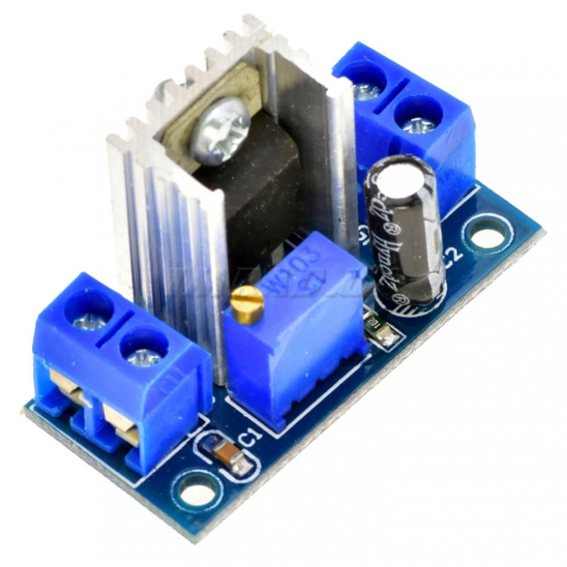 На платі модуля розташовані гвинтові клеми для підключення проводів, потенціометр налаштування вихідної напруги та мікросхема в корпусі TO-220 із радіатором. Варто пам’ятати про експлуатаційні обмеження лінійного стабілізатора і не використовувати його в критичних режимах. Мікросхема відчутно нагрівається, розсіювана потужність не повинна перевищувати 20 Вт.
