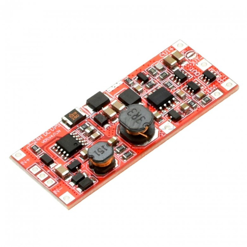 Пристрій живиться від джерела постійної напруги 12–15 В. Модуль розрахований на вихідний струм не більше 1 А і потужність 24 Вт. Однак тривала робота на максимальному струмі не рекомендується, оскільки призводить до значного нагрівання. Всі компоненти розташовані на одному боці плати, що спрощує встановлення. Рекомендується приклеїти модуль на радіатор для кращого охолодження.