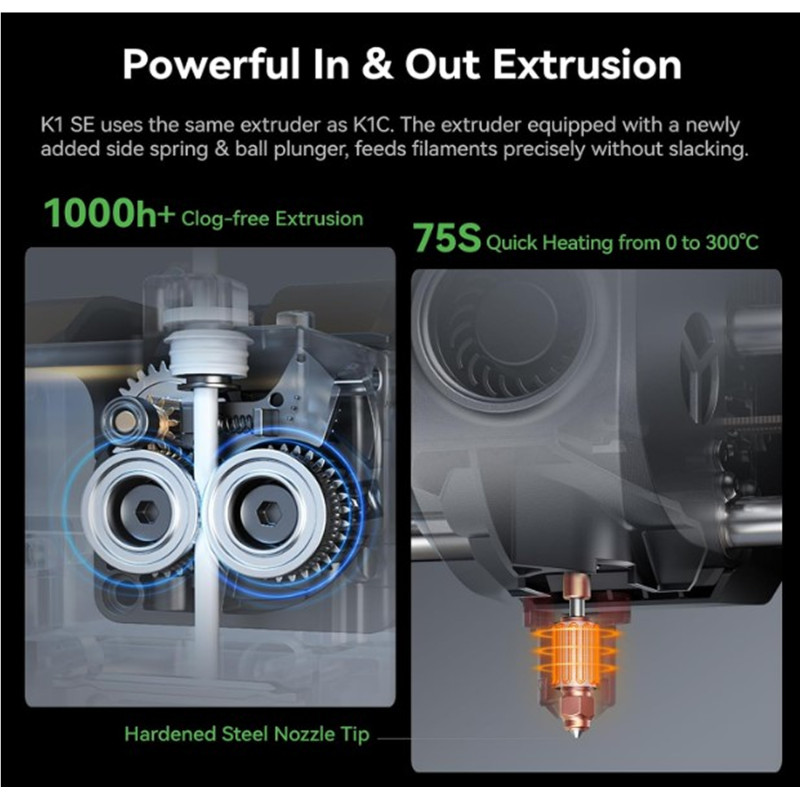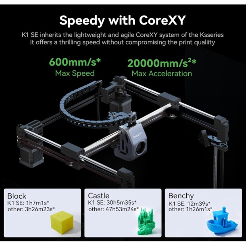 K1 SE 3D-принтер успадкував легку та маневрену систему CoreXY серії K1. Максимальна швидкість 600 мм/с і прискорення 20000 мм/с². Він може підтримувати якість друку під час друку на високій швидкості, це в 12 разів швидше, ніж інший звичайний 3D-принтер.