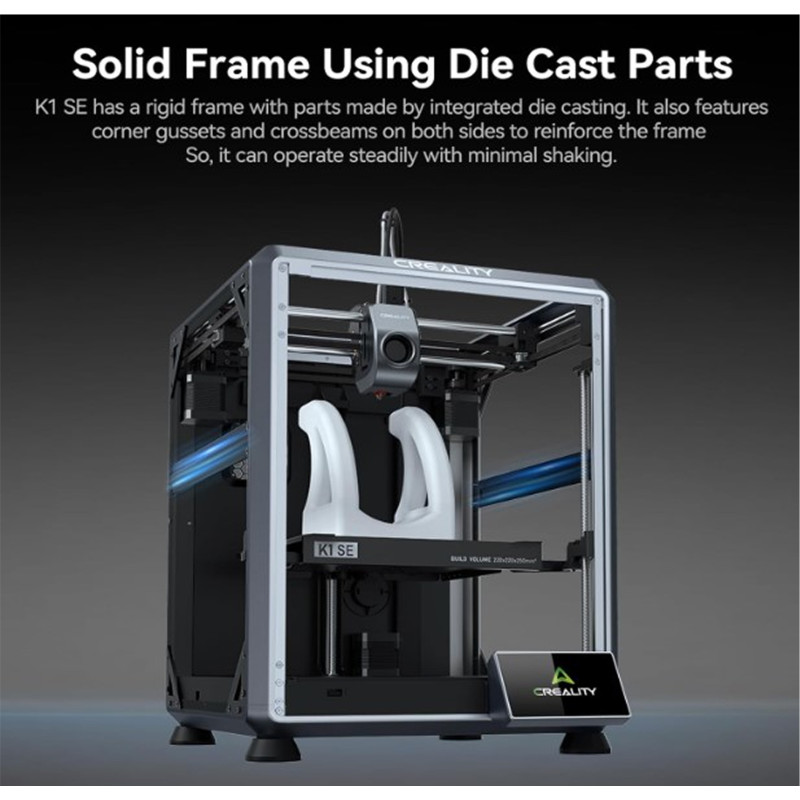 Суцільна рама з використанням литих деталей: D-принтер Creality k1 se має жорстку раму з деталями з алюмінієвого сплаву, виготовленими шляхом інтегрованого лиття під тиском. Він також має кутові ластовиці та поперечини з обох боків для посилення рами. Отже, цей 3d-принтер creality може працювати стабільно з мінімальним струшуванням.
