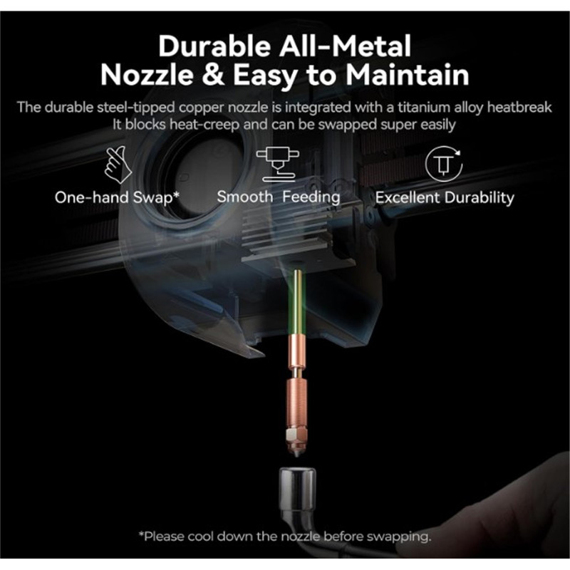 Міцна триметалева насадка та Hotend потужністю 60 Вт: Простий в обслуговуванні та швидка заміна. Міцна мідна насадка зі сталевим наконечником інтегрована з терморозривом з титанового сплаву. Він блокує теплову повзучість і може бути дуже легко замінений. Керамічний нагрівач, швидкий нагрів 75 с від 0 до 300 ° C, оточуючи хотенд, може повністю розплавити ABS* та інші нитки для надшвидкого друку.