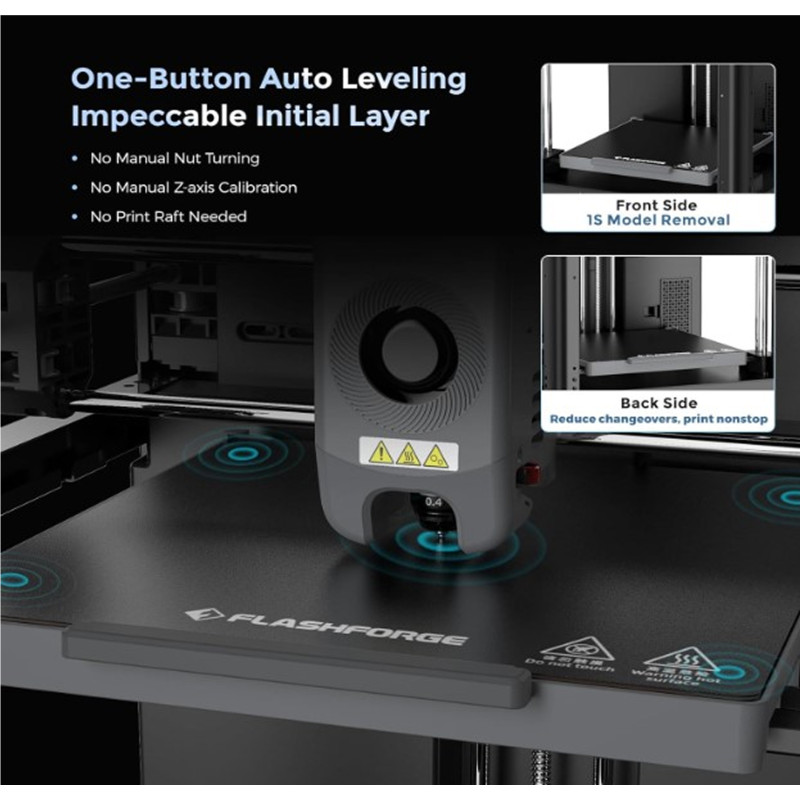 Автоматичний друк одним клацанням миші: насолоджуйтесь безпроблемним 3D-друком із серією Adventurer 5M. Насолоджуйтесь автоматичним вирівнюванням ліжка для бездоганних перших шарів, забезпечуючи стабільне зчеплення та економлячи час без необхідності ручного регулювання.