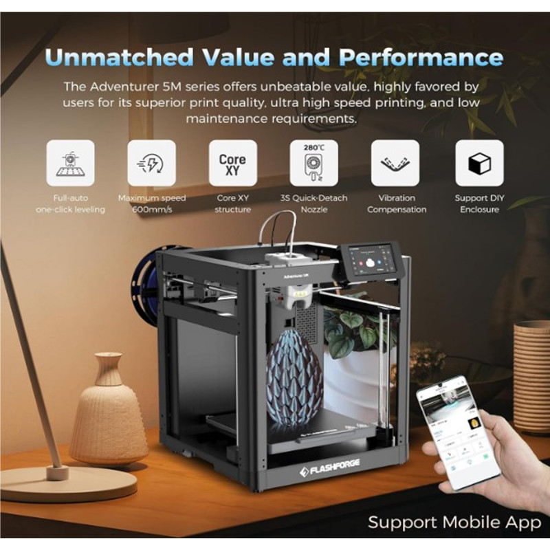 Неперевершена якість друку та віддалений моніторинг: завдяки соплам з двома вентиляторами, компенсації вібрації, кільком розмірам сопел (0,25-0,8 мм) і прямому екструдеру 280°C AD5M забезпечує найвищу якість друку. Використовуйте мобільну програму Flash Maker для моніторингу в реальному часі та інтелектуальної роботи, що робить ваш процес друку бездоганним.