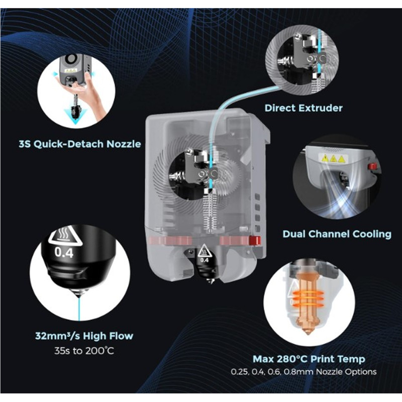 Розумний та ефективний дизайн: швидка 3-секундна заміна сопла, сопло з високим потоком 32 мм³/с і швидке 35-секундне нагрівання до 200 °C забезпечують стабільний високошвидкісний друк. Його двостороння платформа PEI та універсальні опції забезпечують легке зняття та адаптивність для різних творчих проектів