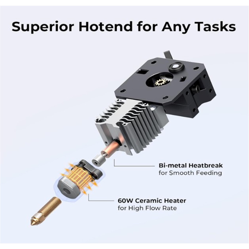 Сумісність з нитками: Екструдер спрайтів із прямим приводом цього 3D-принтера Creality Ender надійно друкує такими нитками, як Hyper PLA, PETG, ABS, TPU (95A) і ASA. Ця сумісність ідеально підходить для широкого спектру проектів – від деталізованих моделей до навчальних інструментів і функціональних прототипів.