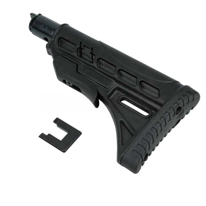 Виріб вирізняється дуже міцною, надійною та зручною конструкцією. Корпус прикладу виготовлений з ударостійкого збройового ABS-пластику. Труба прикладу, кріплення та штифт кнопки фіксатора виконані зі збройової сталі. Також приклад укомплектований гумовим потиличником для пом’якшення віддачі при пострілі та запобігання ковзання по одягу.