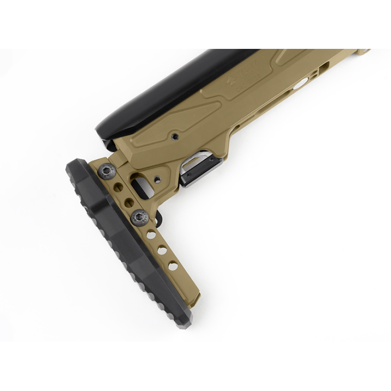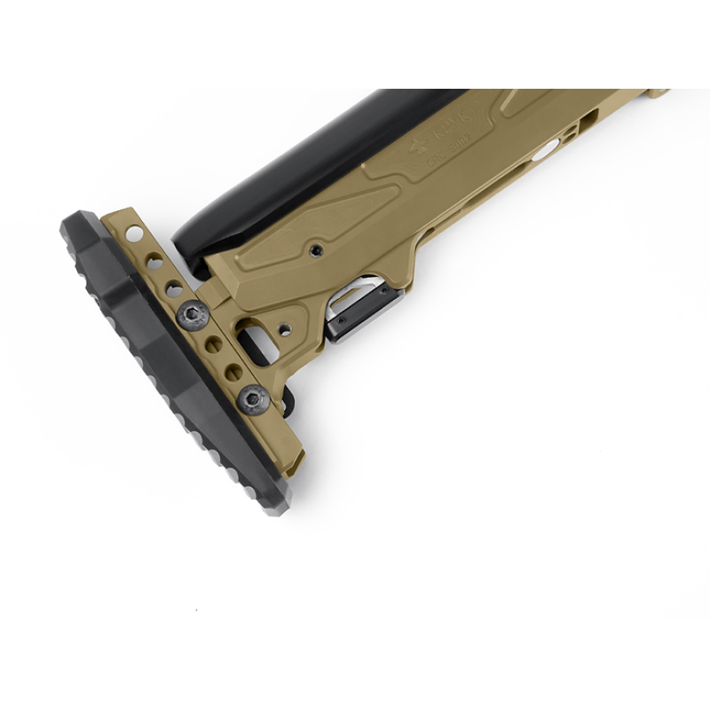 Приклади CRC 5002/9035, CRC 5002/9033, CRC 5002/9037R – це високоякісні фарбовані приклади для АК від українського виробника Крук. Приклади мають стильний та лаконічний дизайн. В конструкції використано алюмінієвий сплав марки 7075 для навантажених деталей та поліамід для підщічника, що забезпечує надійність у роботі (90% деталей фрезеровані із цільних брусків алюмінію). Максимальний підйом підщічника – 2 см, має 4 положення. Потиличник регулюється по висоті +/- 3 см. Також вироби мають штатні місця для кріплення ременів на стропу і на антабку QD. Приклади покриті хімічно-стійкою фарбою Cerakote – американською зброярською керамічною фарбою, що використовується провідними виробниками стрілецької зброї для покриття свої виробів. Товщина покриття складає близько 50 мікрон.