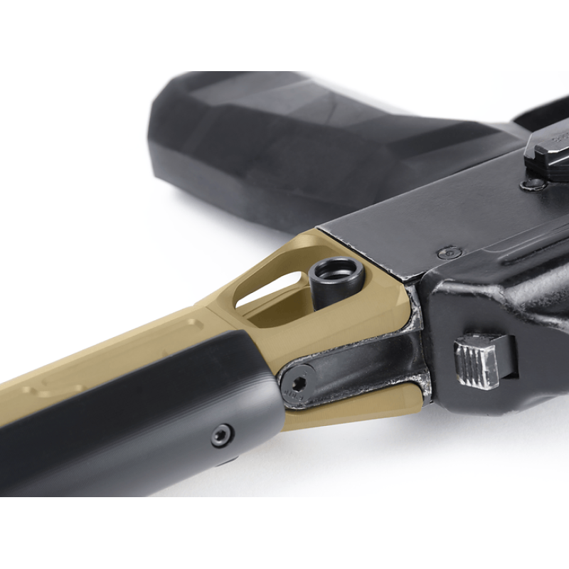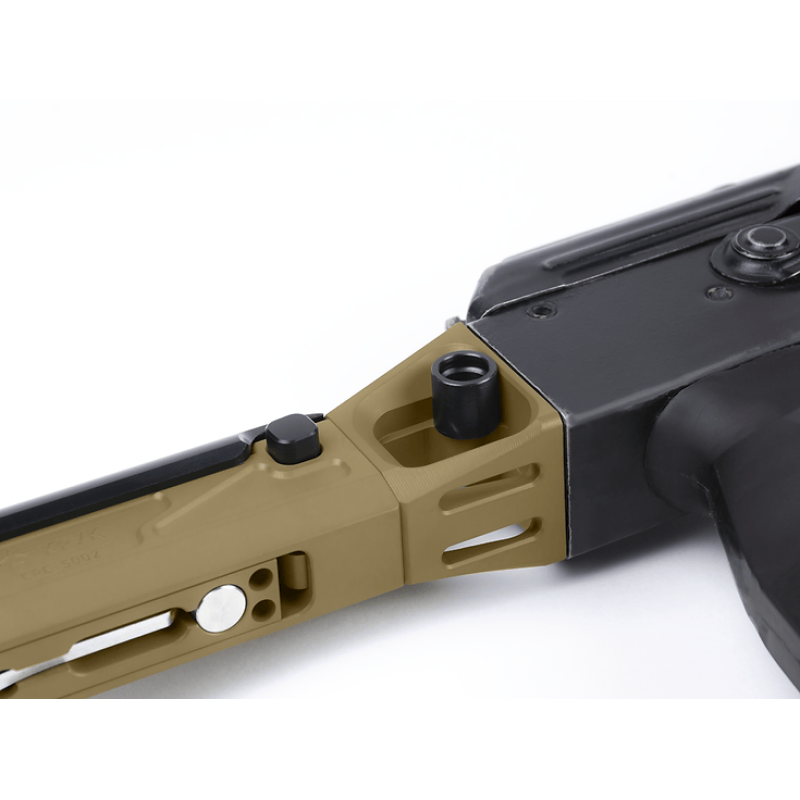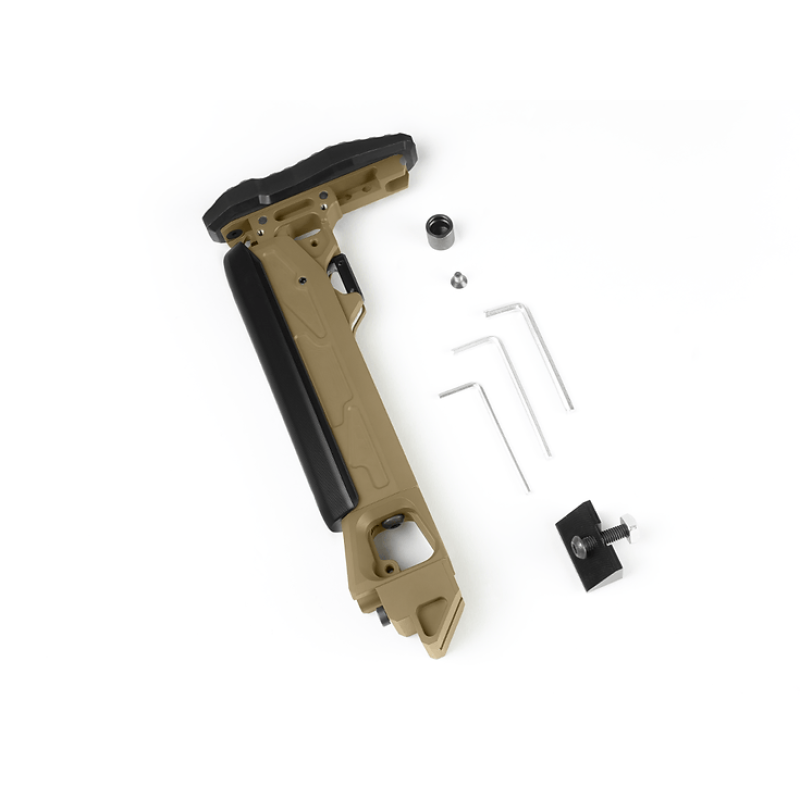 Фіксація прикладу в складному положенні реалізована за допомогою піджиму поворотної частини прикладу. Якщо вас не влаштовує сила піджиму, встановлена виробником, ви завжди зможете налаштувати її до комфортного для вас зусилля складання/розкладання.