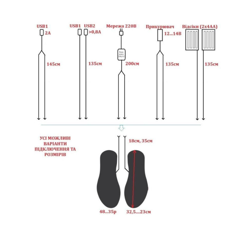 - Довжина дроту від устілки 18 см + 135 см (дроти USB на два виходи).