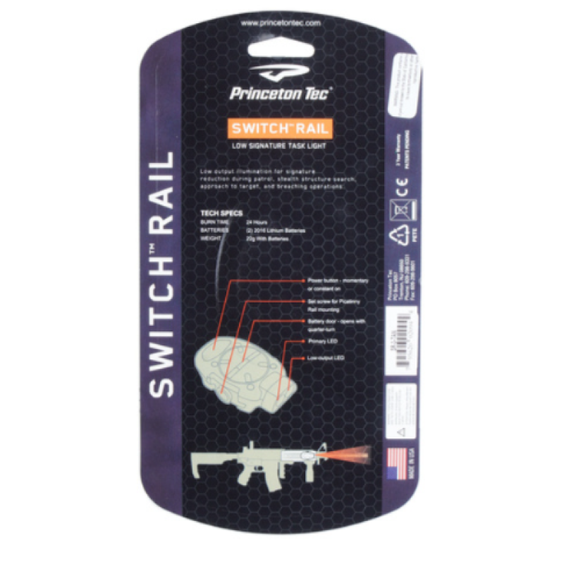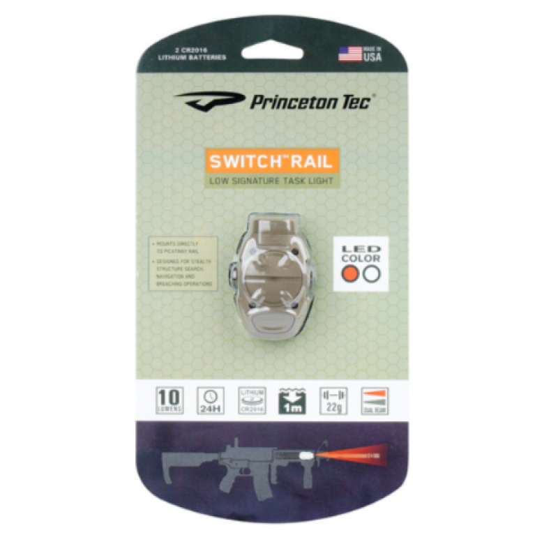 Switch Rail є ліхтариком, що дає малопомітне світло, який встановлюється на зброю. Призначений для навігації, зниження помітності з боку, прихованого пошуку і брічінг-операцій. Ліхтарик має вбудовані світлодіоди, які забезпечують не яскраве освітлення. Switch Rail кріпиться безпосередньо до Пікатінні для безпечного монтажу. Одна кнопка дозволяє отримати доступ до короткочасного або постійного режиму освітлення.