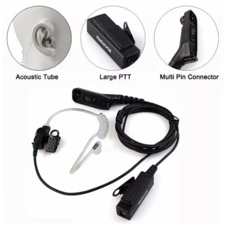 Гарнітура для радіостанції Motorola DP4XXX Series з повітроводом має окремо винесену кнопку PTT (передавання), поєднану з мікрофоном, яку можна прикріпити в будь-якому місці. Звук передається за динаміком, який поєднаний із прозорим повітроводом, роблячи його в такий спосіб мало помітним. Навушник/динамік щільно прилягає до вуха, що робить ваші розмови конфіденційними.