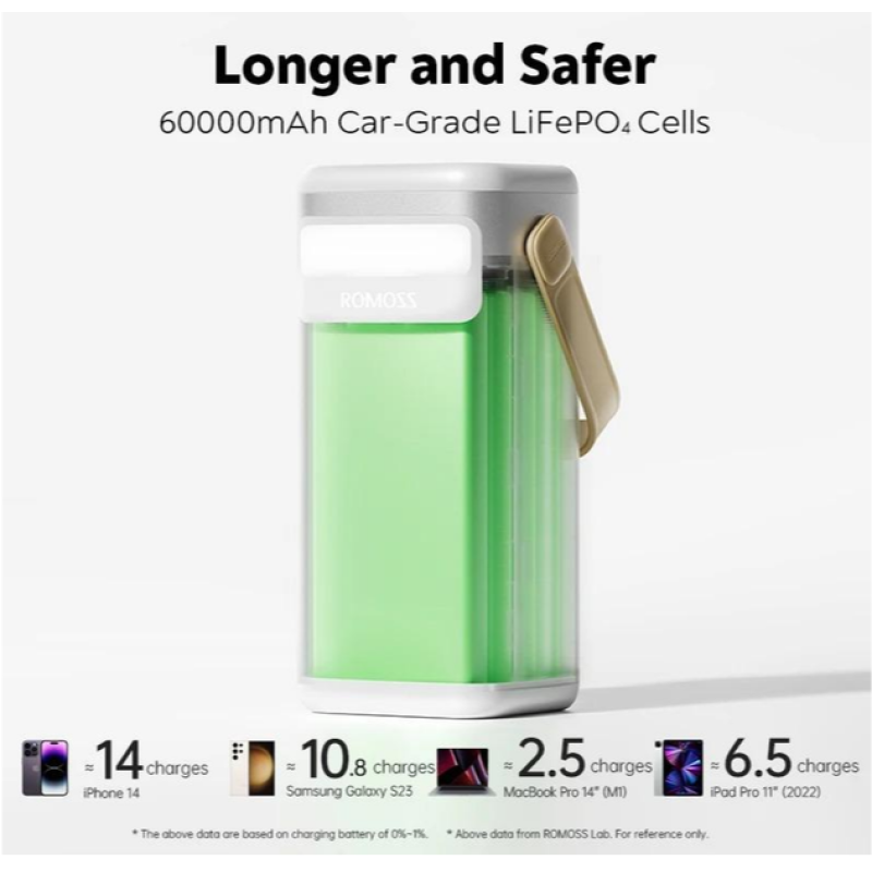 ROMOSS PMT60 Power Bank, 60,000mAh 100W Portable Charger for Laptop. Швидко заряджайте свої пристрої за допомогою нашого потужного та надійного портативного зарядного пристрою на 60,000mAh. Ідеально підходить для зарядки ноутбуків, смартфонів, планшетів та інших пристроїв, цей павербанк забезпечить вам надійне живлення навіть у найтриваліших подорожах. Завдяки трьом вихідним портам і двом вхідним портам ви зможете заряджати до трьох пристроїв одночасно.