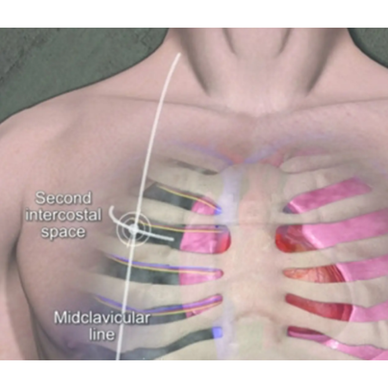 3) Визначте точку введення ARS Needle. Декомпресійну голку слід вводити в пошкоджену половину грудної клітини, міжреберний проміжок між 2 і 3 ребром, по верхньому краю 3 ребра, провівши проекцію вертикально від соска у напрямку до ключиці. Проведіть дезінфекцію місця введення.