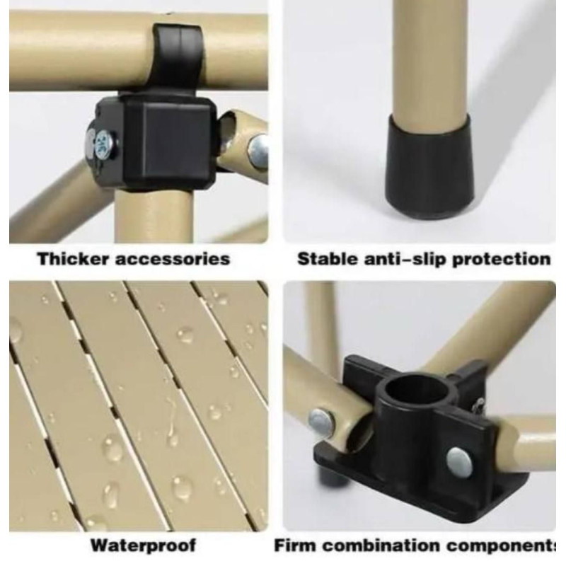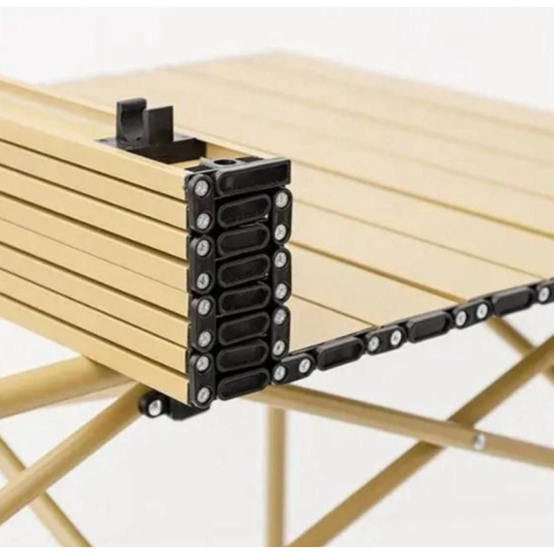 Будова каркаса дозволить комфортно поставити внизу ноги, їм нічого не заважатиме. Всі сполучні елементи настільки прості, що зібрати предмет вийде дуже швидко, не докладаючи особливих зусиль. Вага портативної стільниці невелика, для її виробництва, як і для каркасу, використовувалися лише легкі матеріали. Стіл виготовлений з алюмінію та пластику. Технологія виготовлення поверхні була продумана зі складаних рейок. Це дозволяє заощадити місце при транспортуванні столу для риболовлі та пікніка.