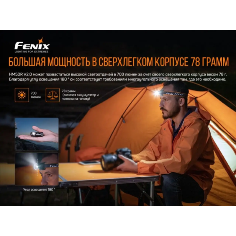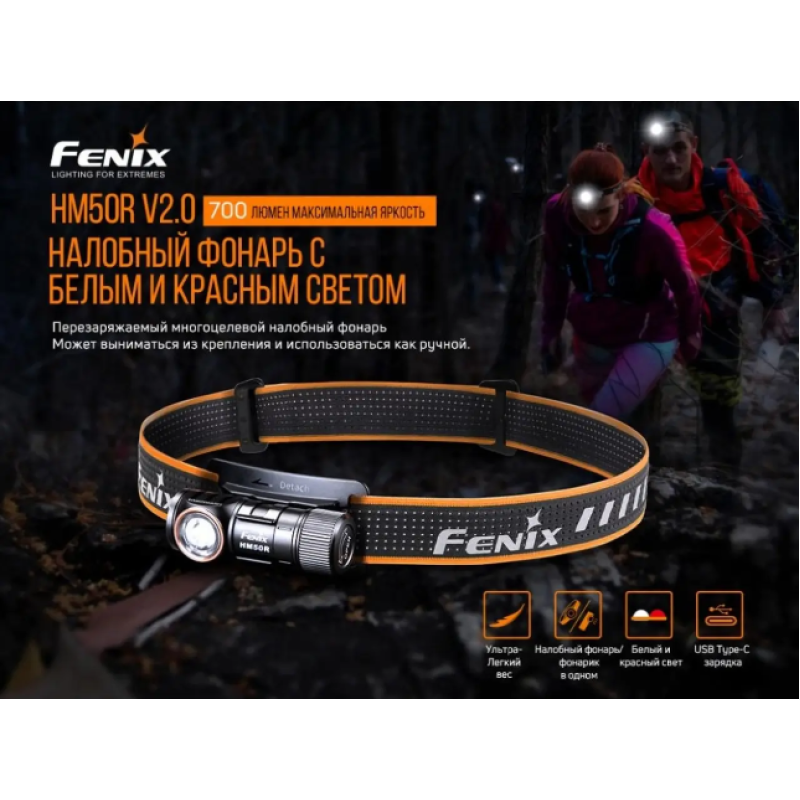 Модель Fenix HM50R V2.0 це багатофункціональний налобник, що перезаряджається. Він стане в пригоді під час активного відпочинку і туризму, наприклад, коли мова йде про кемпінг, походи, або роботу в умовах нестачі освітлення. Живлення здійснюється від літій-іонного акумулятора 16340, що перезаряджається, і цей акумулятор представлений у комплектації. Найбільший світловий потік становить 700 люменів, а далекобійність променя - 115 метрів. Для роботи моделі використовується діод знаменитого виробника Cree XP-G3 S4, освітлення - біле. Термін служби такого діода досягає 50 тисяч годин. Крім білого світла також тут можливе і червоне світло.