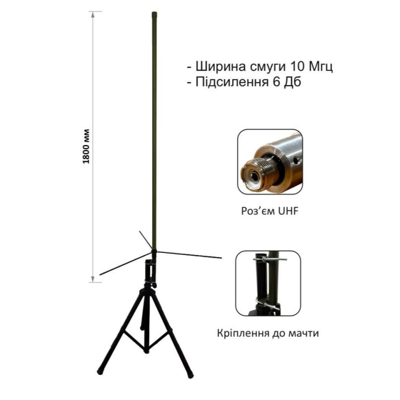 Колінеарна антена діапазону vhf Green - довжиною 1,8 метра. Працює в діапазоні 150-174 Мгц. Дані антени вузькополосні, але найефективніші на ринку. Підсилення 6 дБ. Ширина полоси 10 МГц Максимальна потужність 200 Вт. Застосовано особиливе маскування зеленого кольору, для зручнішого маскування і злиття з оточуючим середовищем.