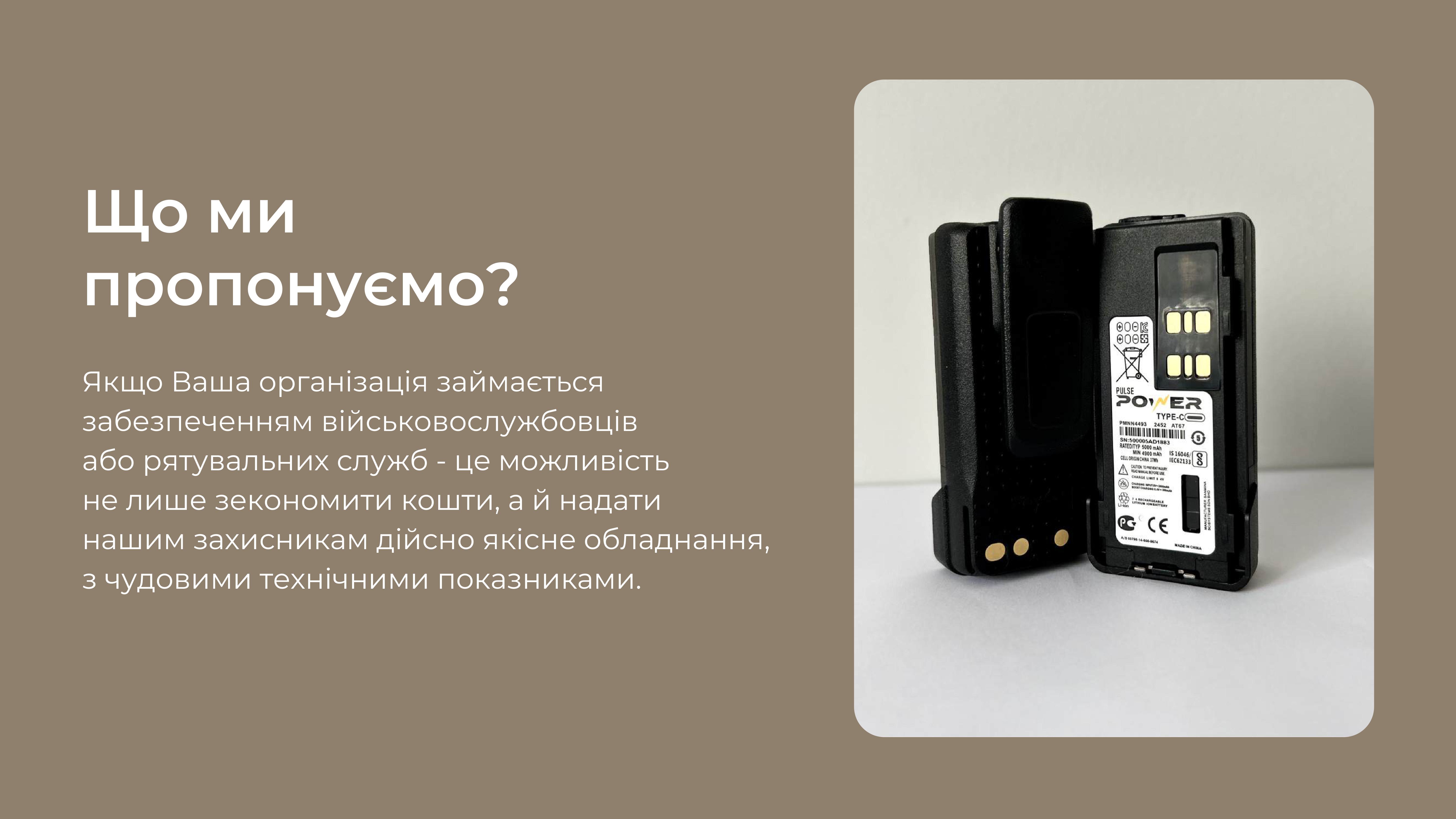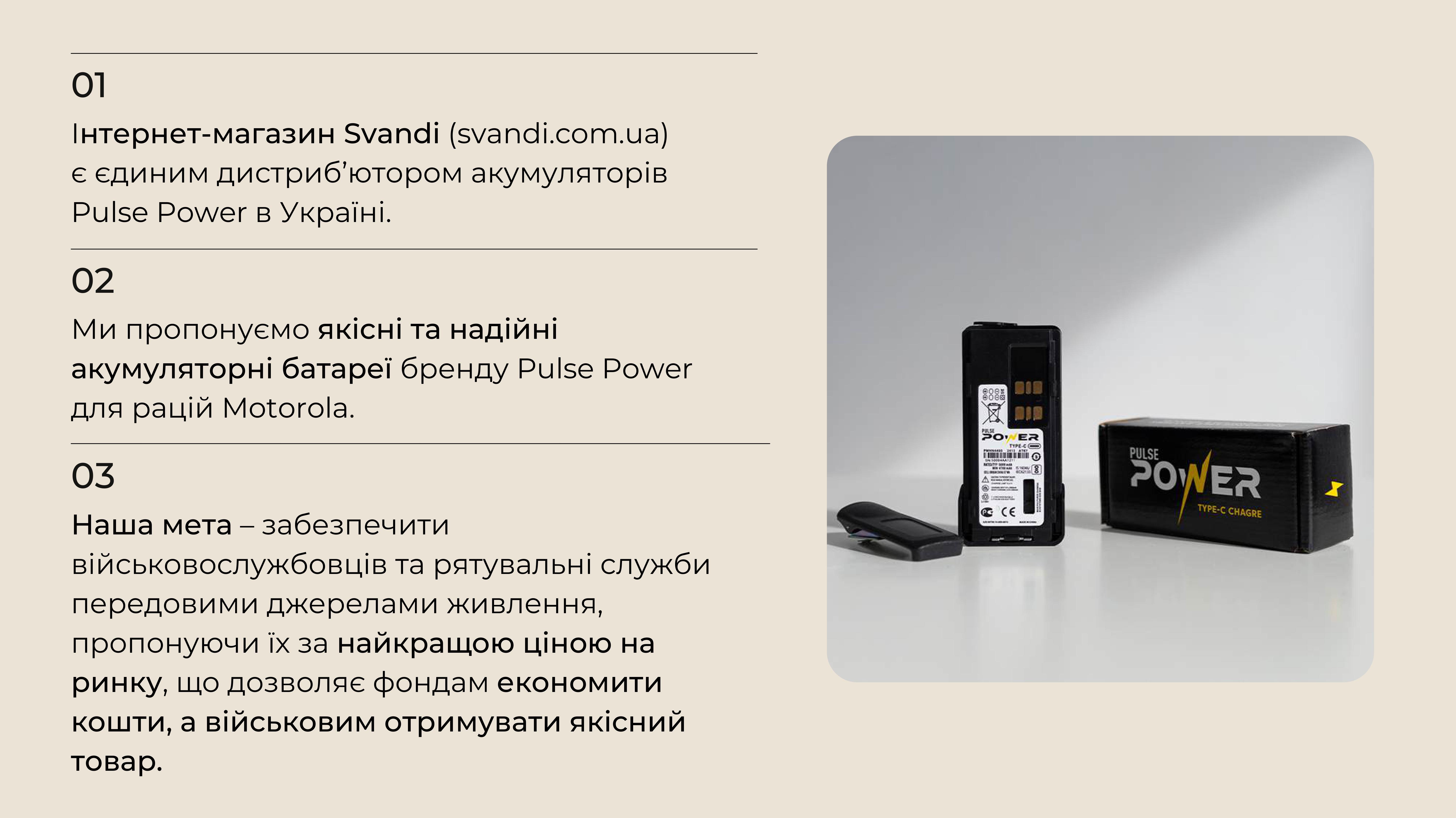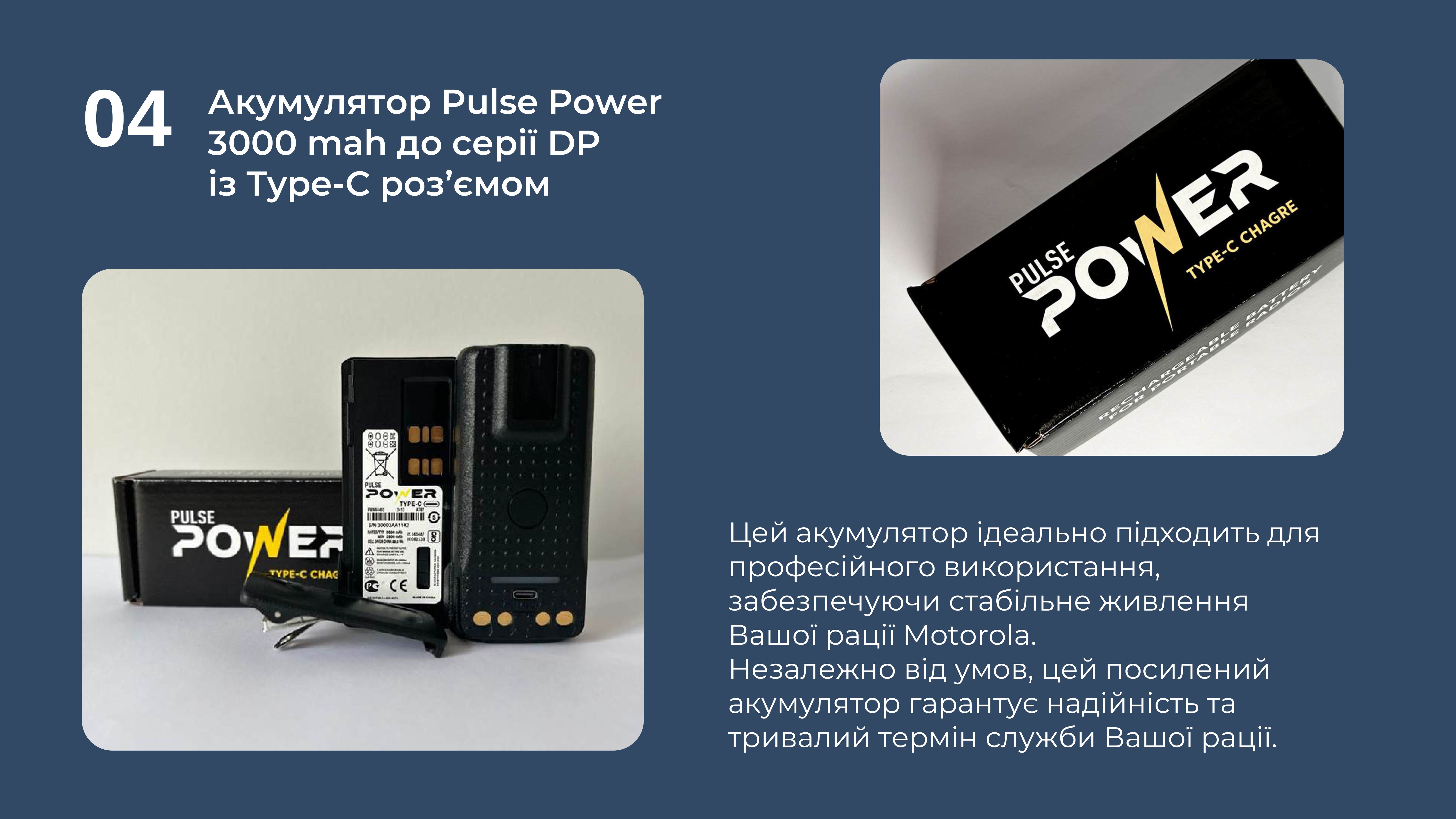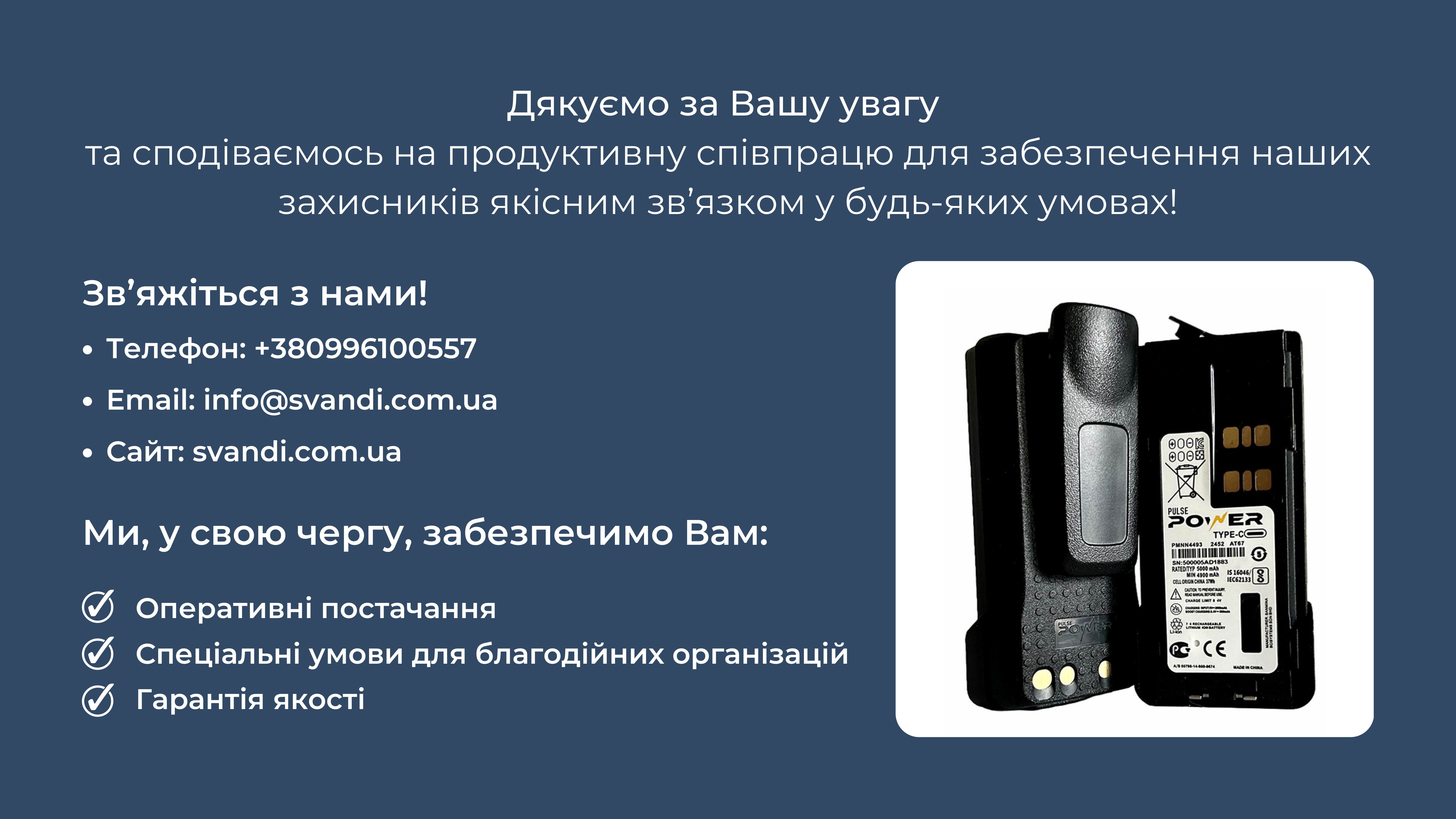 Ми являємося єдиним дистриб'ютором якісних та надійних акумуляторів бренду Pulse Power до рацій Motorola, і пропонуємо Вам придбати їх за максимально вигідними умовами, а відповідно, зекономити кошти та отримати якісне обладнання для наших війскових.