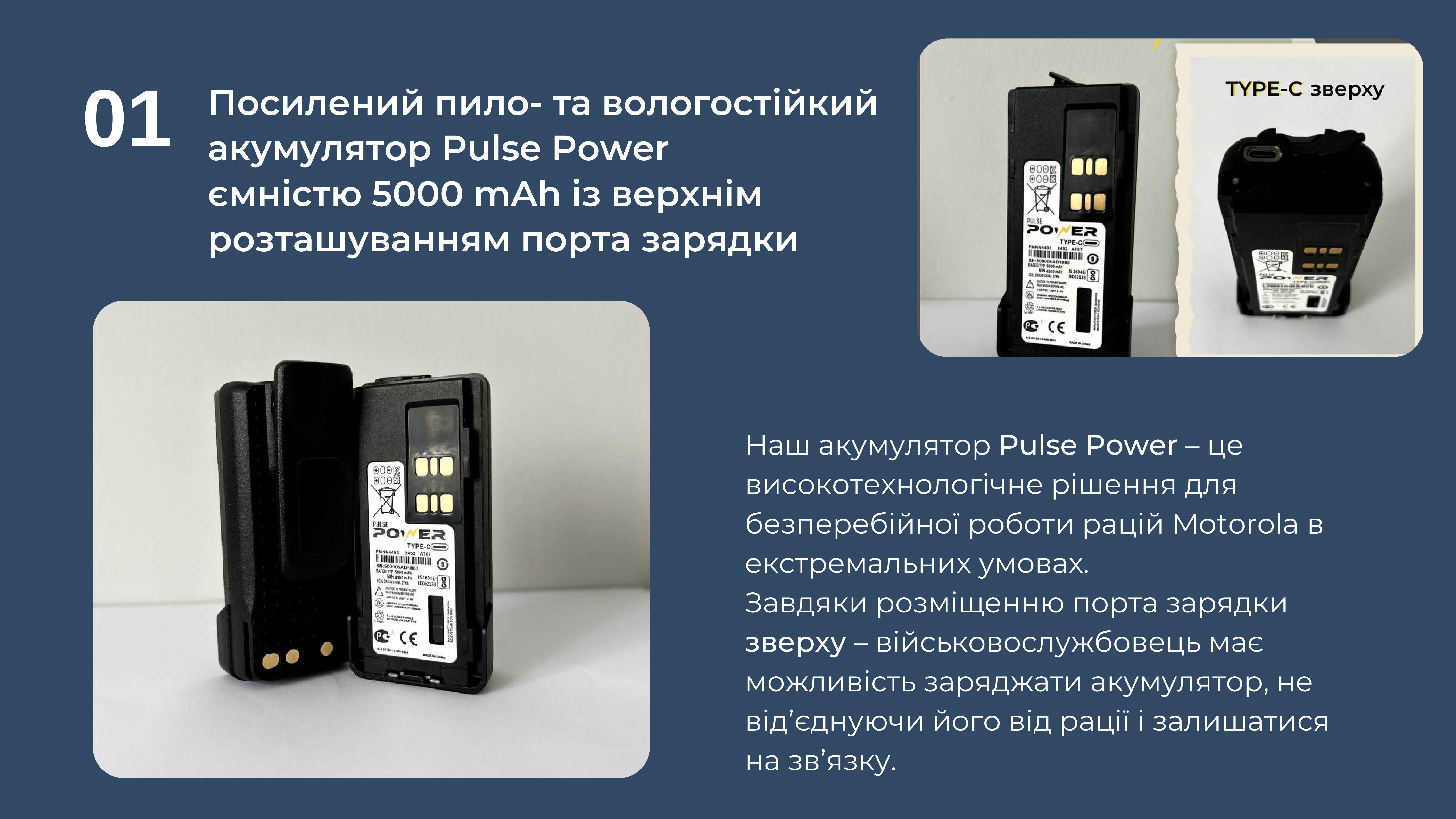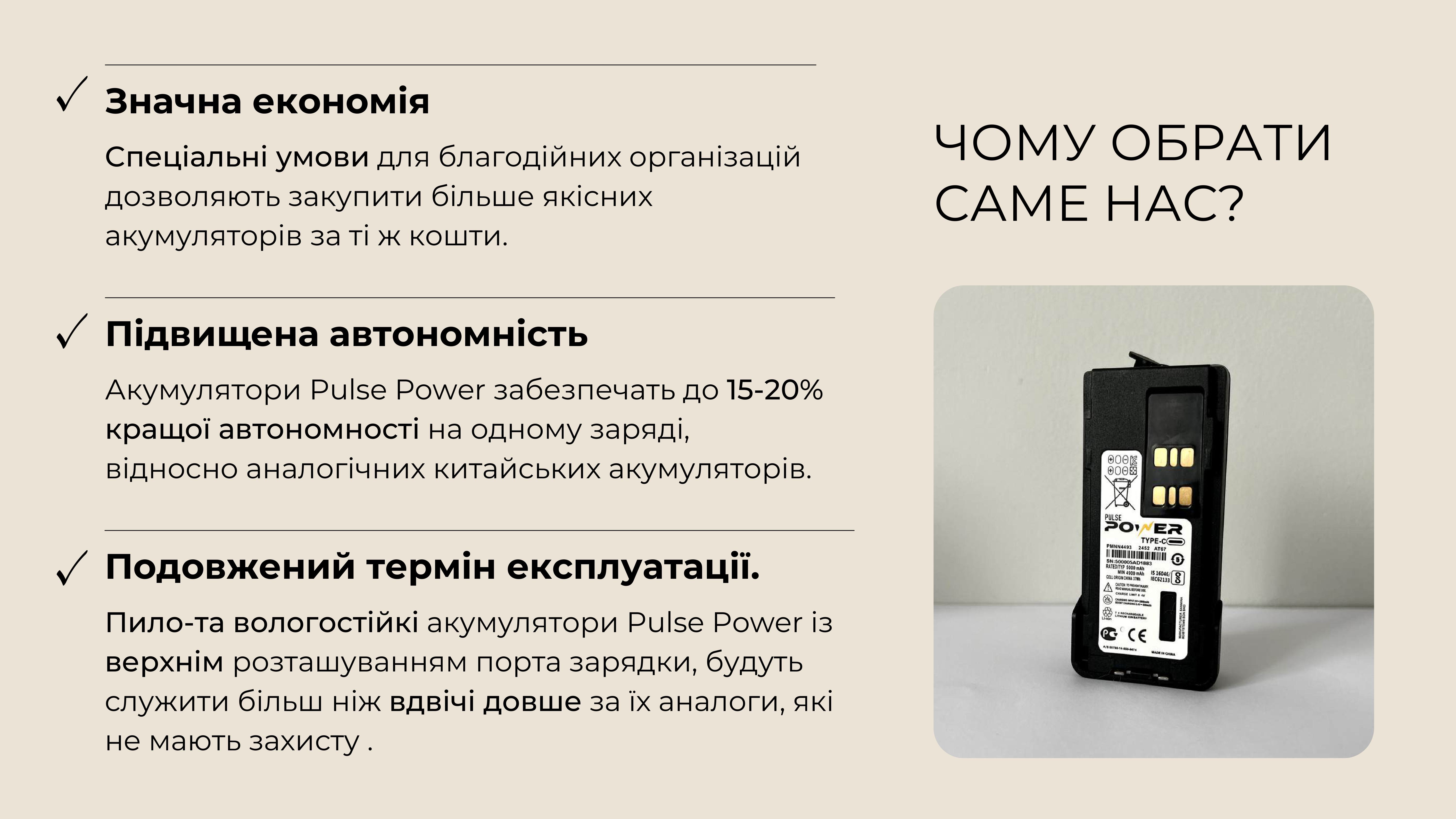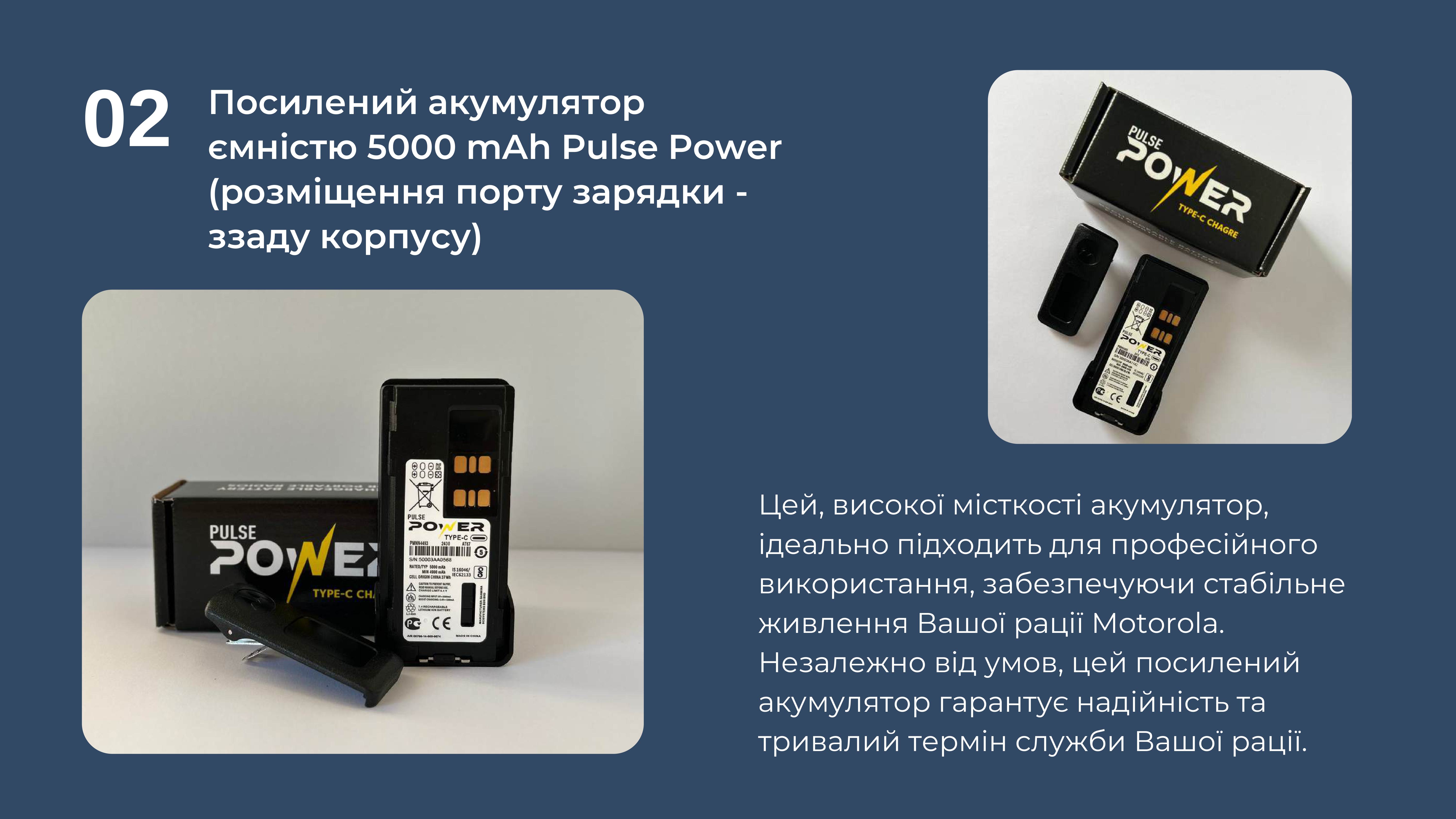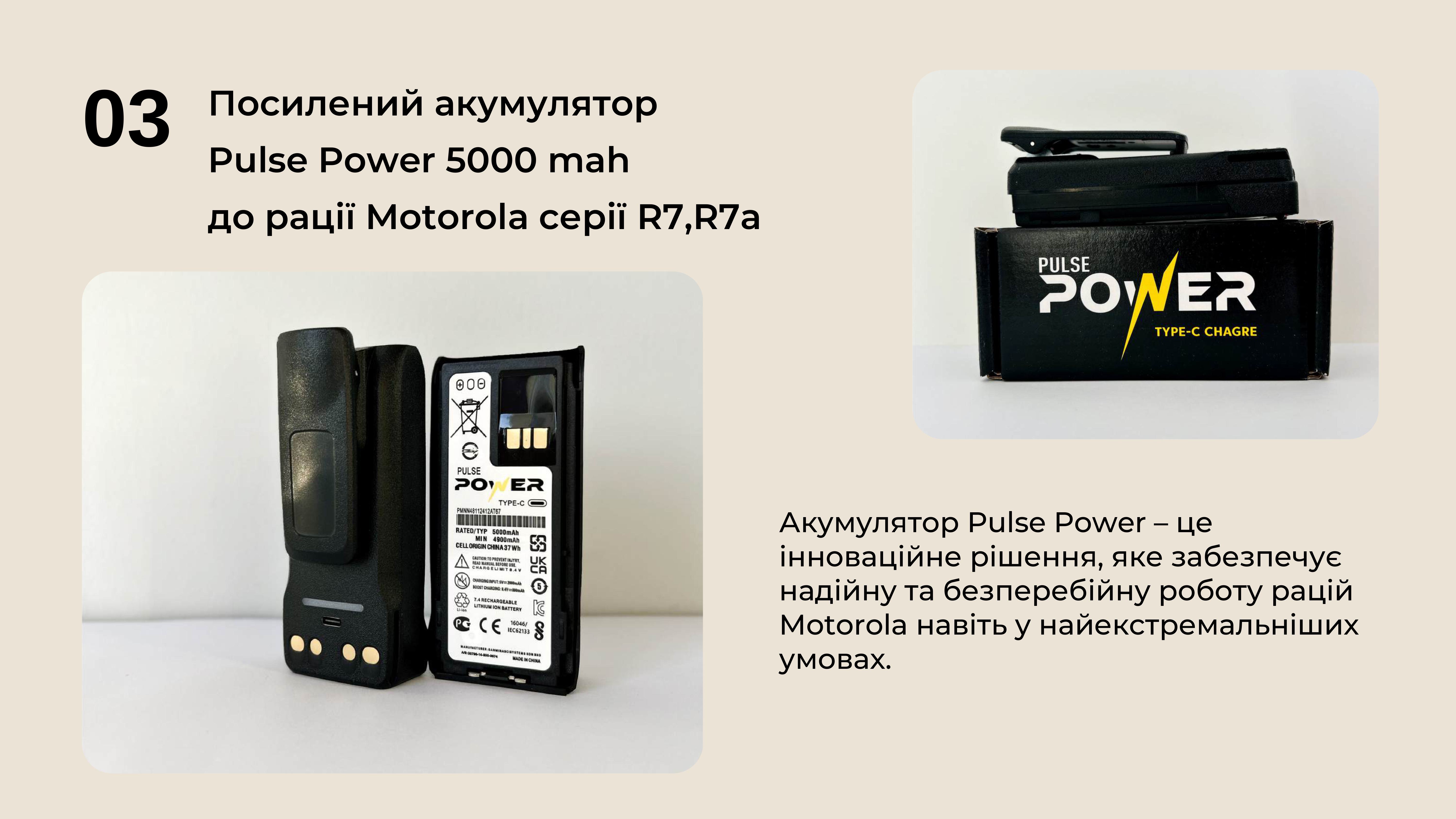 Ми являємося єдиним дистриб'ютором якісних та надійних акумуляторів бренду Pulse Power до рацій Motorola, і пропонуємо Вам придбати їх за максимально вигідними умовами, а відповідно, зекономити кошти та отримати якісне обладнання для наших війскових.
