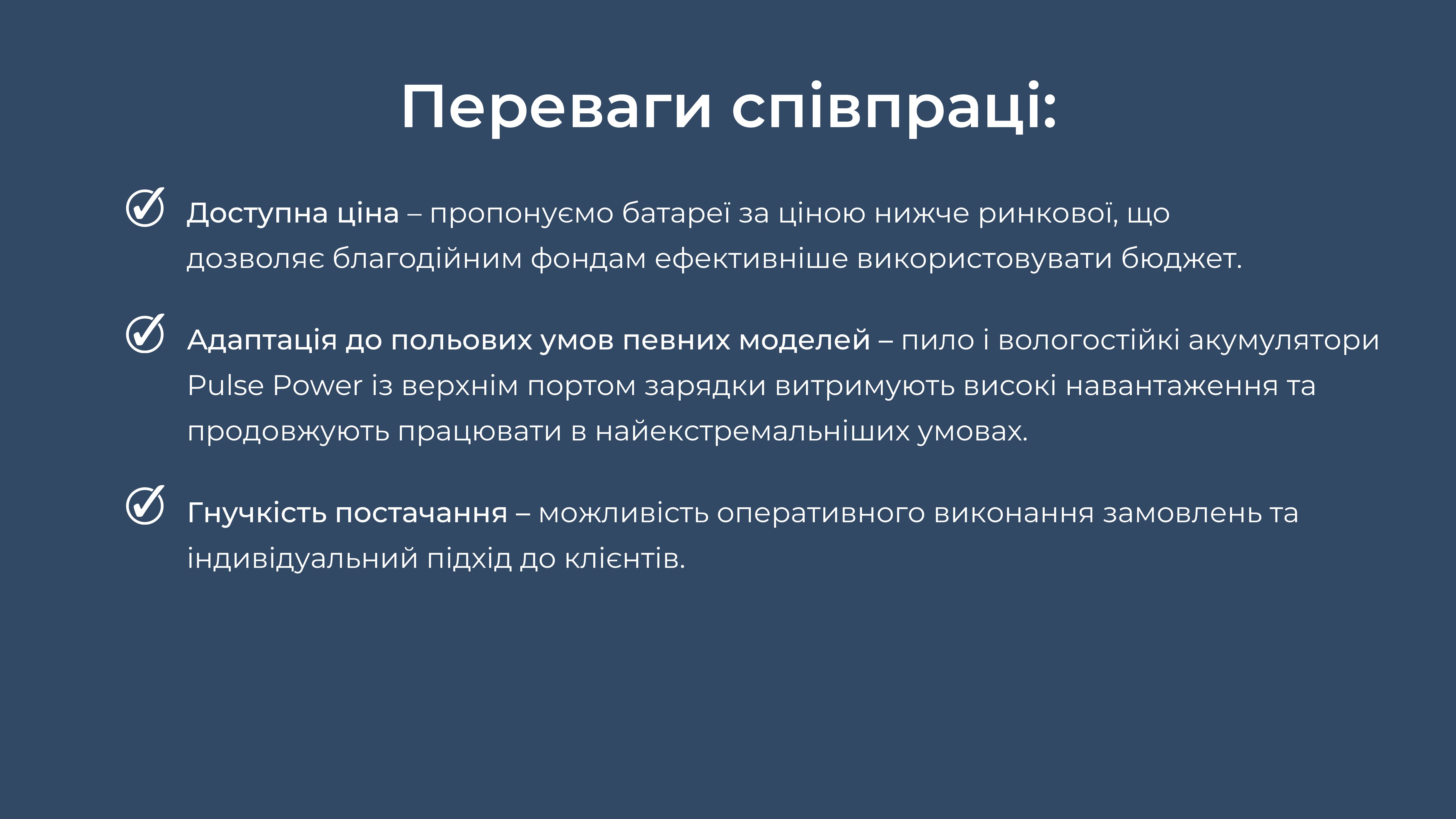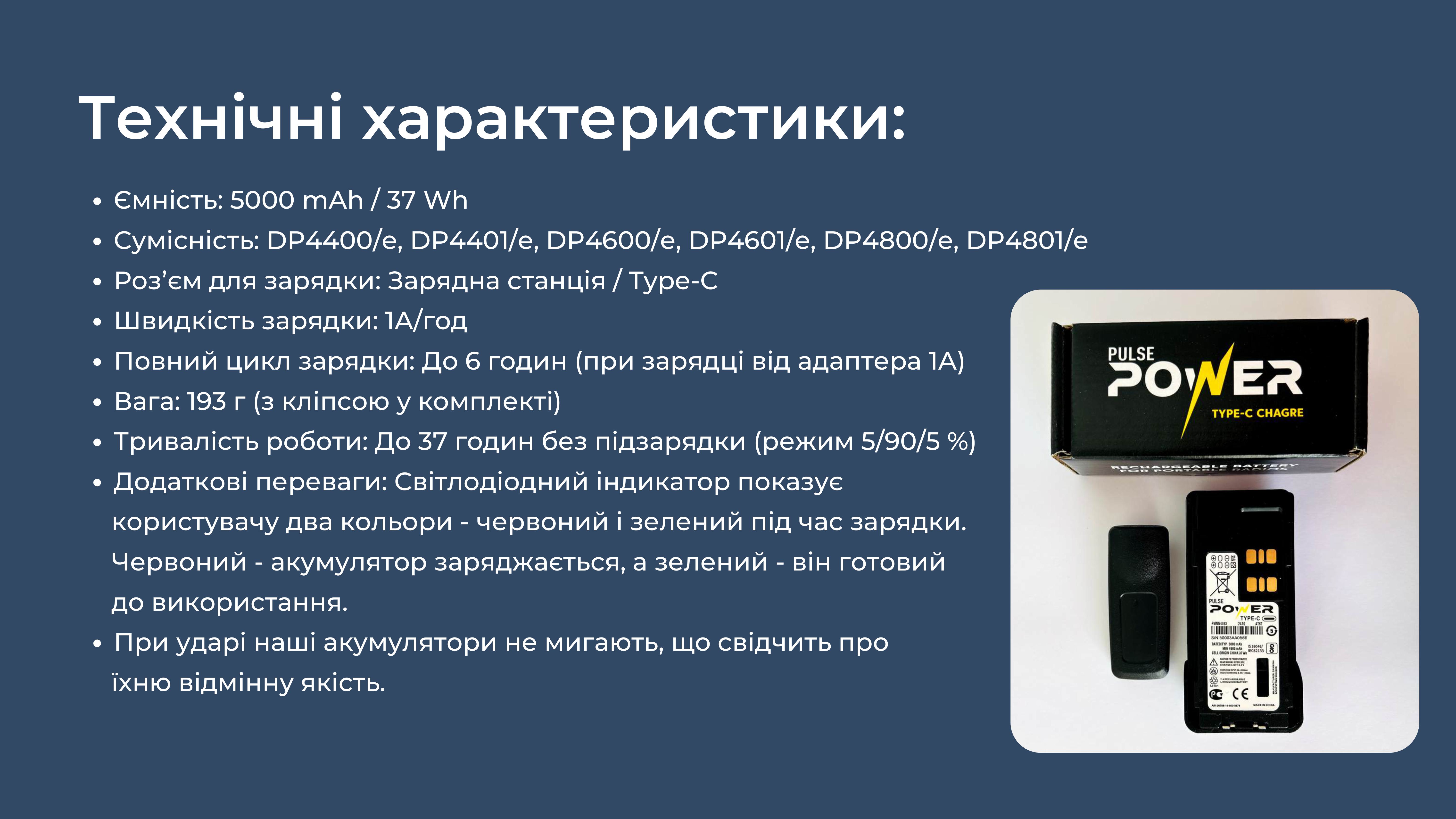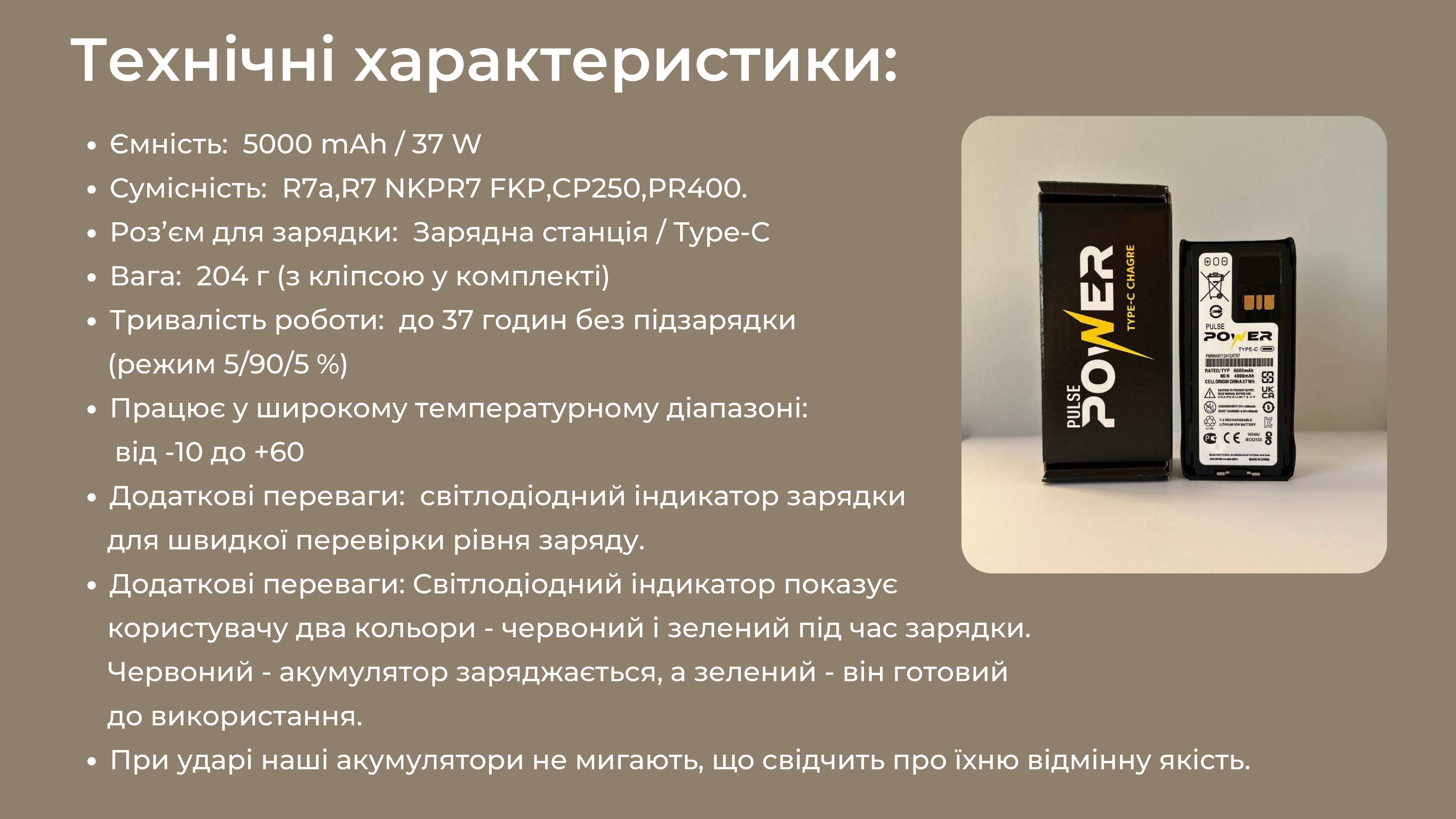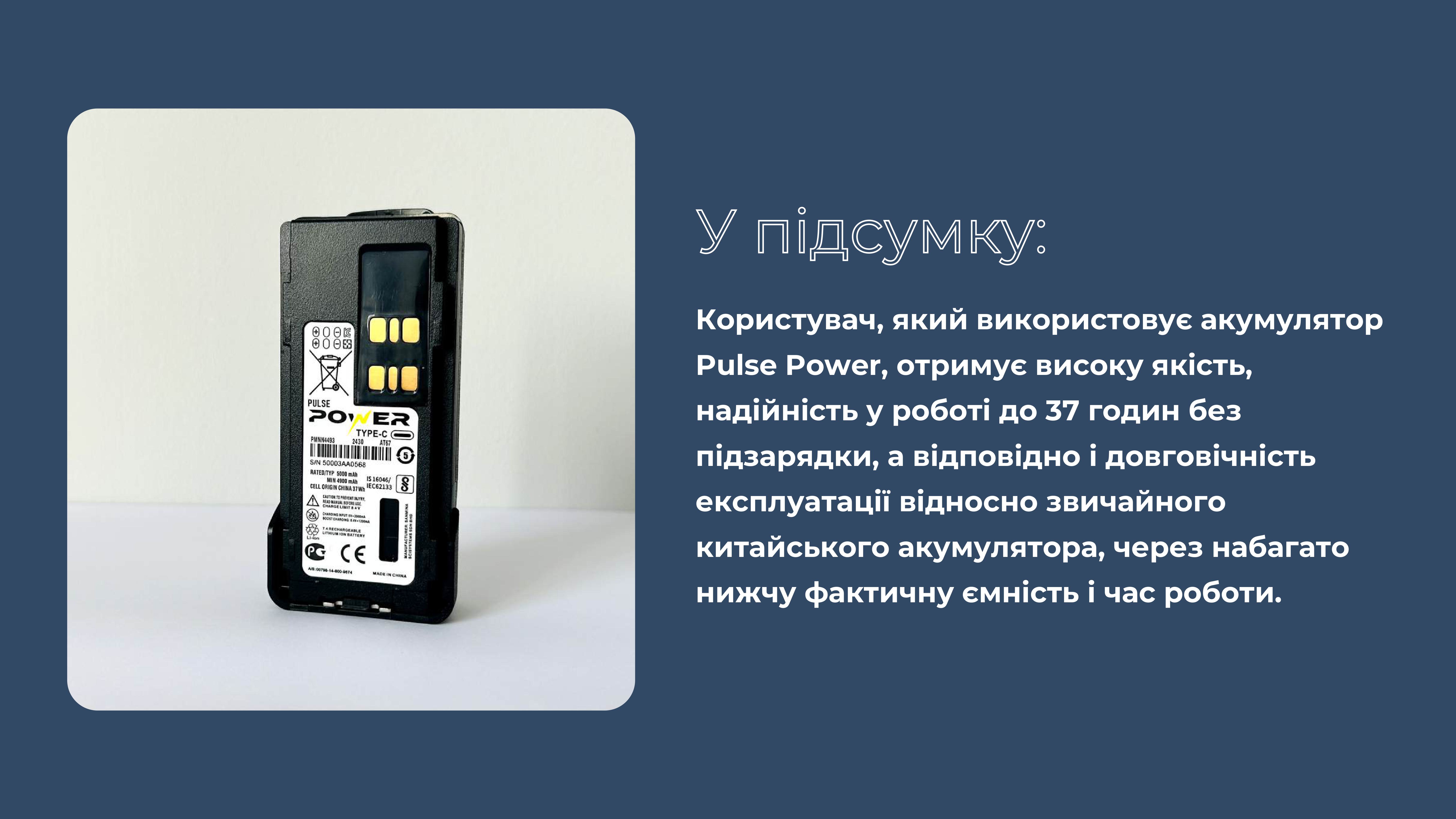 Ми являємося єдиним дистриб'ютором якісних та надійних акумуляторів бренду Pulse Power до рацій Motorola, і пропонуємо Вам придбати їх за максимально вигідними умовами, а відповідно, зекономити кошти та отримати якісне обладнання для наших війскових.