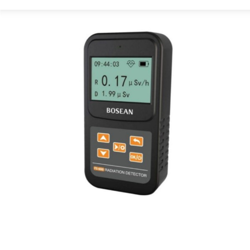 Дозиметр-радіометр, лічильник Гейгера — прилад для вимірювання радіації Bosean FS-600 є найкращим рішенням для контролю радіаційного випромінювання в побуті та в промисловості. Це компактний і точний пристрій, який вимірює гама, бета та рентгенівське випромінювання до максимального значення з мінімальною похибкою. Детектор радіації вирізняється високою чутливістю і гарною реакцією на різку зміну рівня радіації, можна швидко та точно визначити рівень радіації від об'єкта або знайти джерело випромінювання. Дозиметр — детектор радіації Bosean FS-600 має компактні розміри, що зручно під час використання в польових і побутових умовах. Ергономічний дизайн, міцний корпус з ABS-пластику й інтуїтивно зрозумілий інтерфейс роблять користування пристроєм максимально ефективним. Дозиметр виводить показники вимірювань на РК-дисплей із підсвіткою, як і індикатор заряду батареї. Ви можете перемкнути дані між стандартним значенням у формі цифр іcoren. У стандартному зображенні зображаються 2 показники: рівень радіаційного випромінювання в реальному часі та загальна отримана доза за час вимірювання. Усі характеристики виводяться в мікрозивертах. У вбудованій пам'яті пристрою зберігаються дані про накопичене значення дози, порозі сигналізації потужності дози та пороговому значення дози, які не будуть втрачені після вимкнення живлення. Пристрій працює від 3 батарейок типу АА.