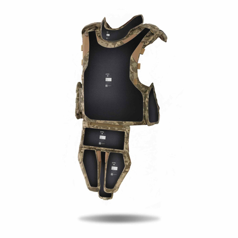 Комплектація: чохол бронежилета, балістичні пакети, модуль захисту шиї, модуль захисту кишківника, модуль захисту паху.