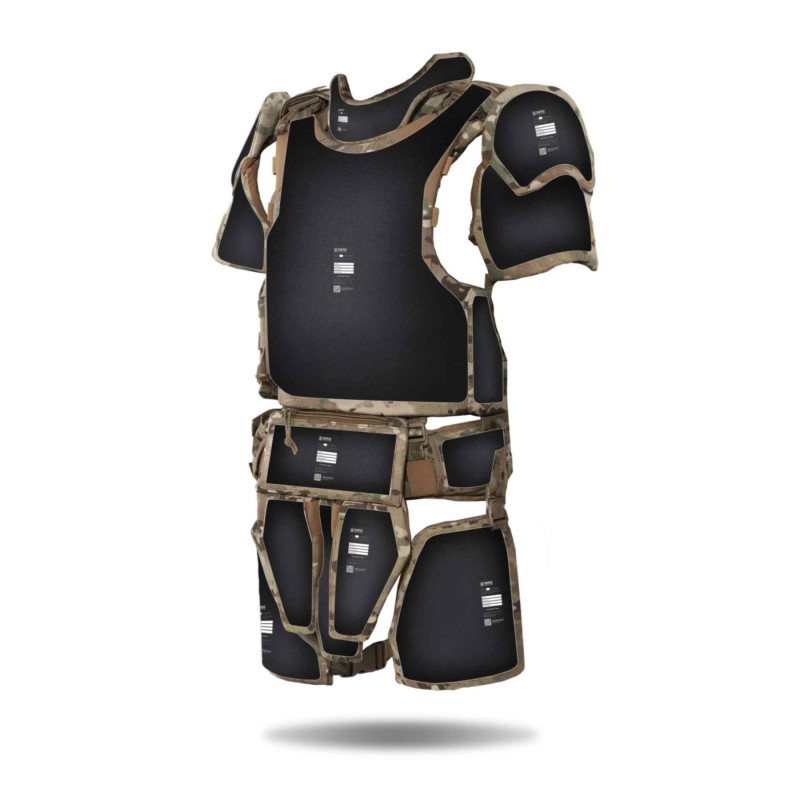 Комплектація: чохол бронежилета, балістичні пакети, модуль захисту шиї, модуль захисту кишківника, модуль захисту паху, РПС, модуль захисту стегон, модуль захисту плечей.