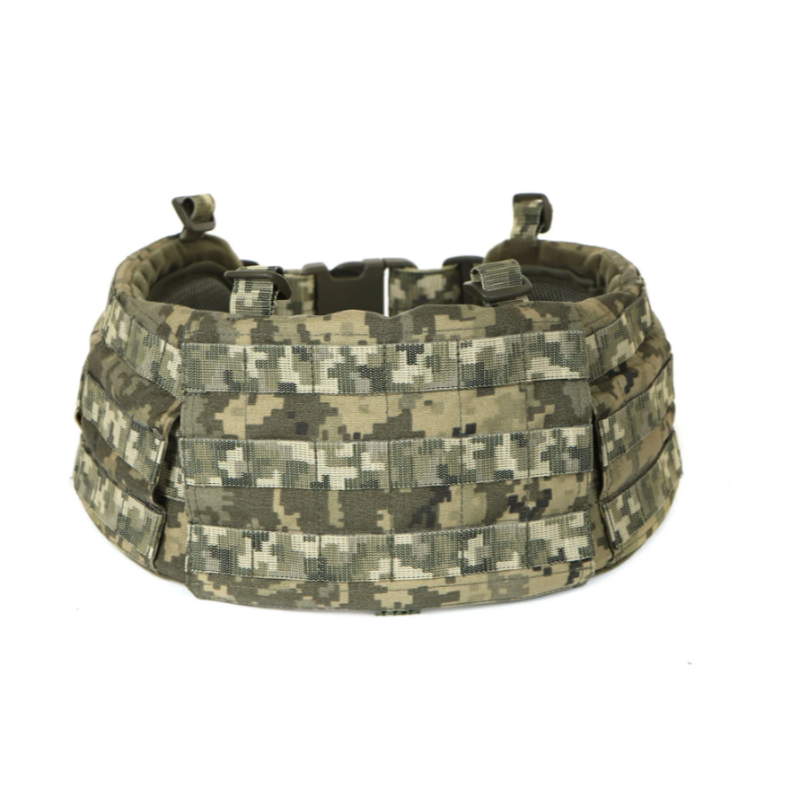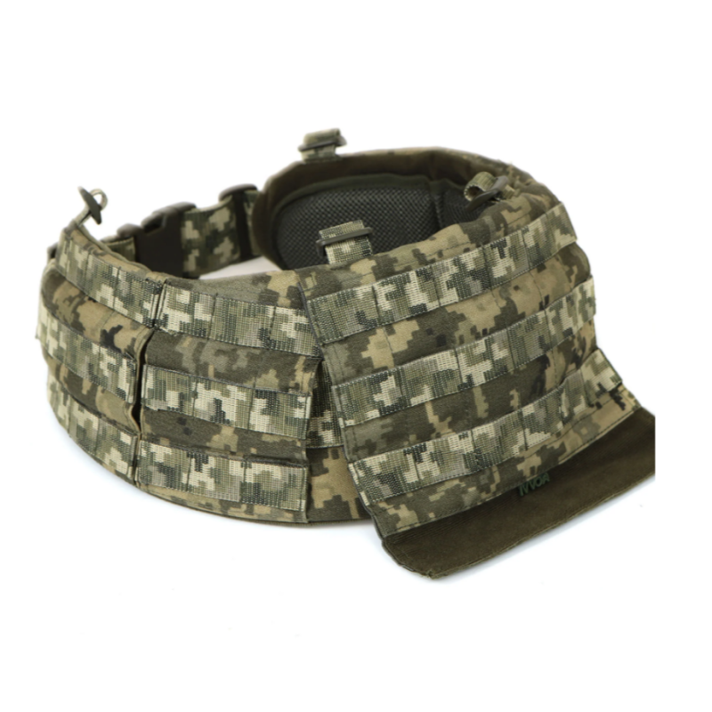 Пояс має анатомічну конструкцію та оснащений знімними буферами, які дають можливість підлаштувати пояс для комфортного використання та підтримувати поясницю. Міцний каркас з інтегрованим спеціальним матеріалом, який не дає поясу деформуватись і провісати під вагою спорядження. Присутня кишеня під балістичний захист.(Балістичний захист 1-го класу під РПС 880х150 мм MOLLI)| Балістичний захист 2-го класу під РПС 800х150 мм MOLLI ).