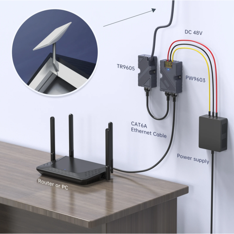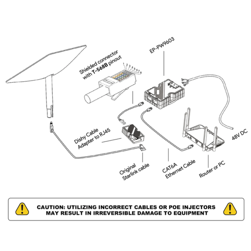 Адаптер EDUP EP-TR9605 Dishy Cable to RJ45 дає змогу під'єднувати пристрій за допомогою кабелю Dishy до стандартного порту Ethernet RJ45. Цей адаптер забезпечує сумісність між пристроями, що використовують різні типи роз'ємів, даючи змогу під'єднувати, наприклад, супутникову тарілку Starlink до PoE-інжектора та/або маршрутизатора, що використовує інтерфейс Ethernet RJ45. В комплекті йде короткий патч-корд для під'єднання до PoE-інжектора.