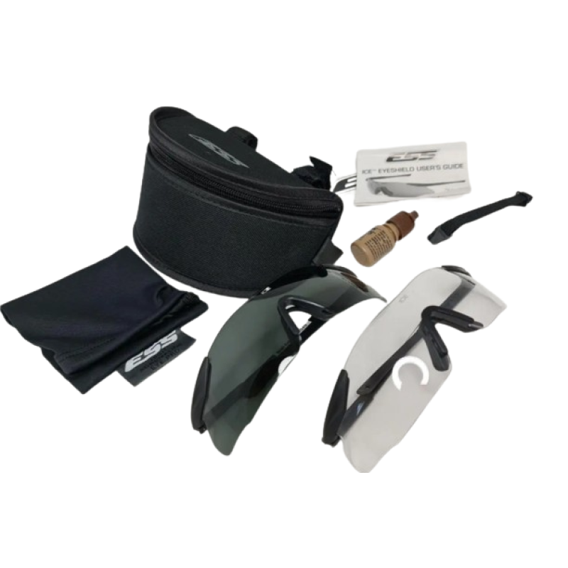 - Два повністю зібраних захисних дужки ICE™ з лінзами Clear & Smoke Grey, еластичним ремінцем, чохлом для лінз/серветкою з мікроволокна, пляшкою протитуманного розчину McNett OpDrops™ і напівжорстким захисним футляром