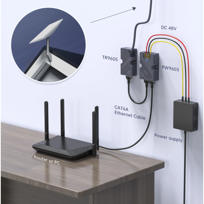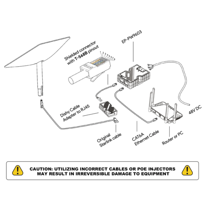 PoE інжектор EDUP EP-PW9603 це пристрій Power over Ethernet (PoE), здатний забезпечувати високу потужність (150 Вт), що підтримує стандарти Gigabit Ethernet (GigE). Має подвійний порт 1Gps RJ45, який дає змогу встановити міжміський зв'язок із файловим сервером або віддаленою робочою станцією. Цей пристрій зазвичай використовується для подачі живлення і передавання даних на інші мережеві пристрої, як-от камери, точки бездротового доступу, IP-телефони, без необхідності використання додаткових адаптерів живлення. Таким чином, цей PoE-інжектор забезпечує високу потужність і сумісний зі стандартами Gigabit Ethernet, даючи змогу під'єднувати та забезпечувати живлення й передавання даних для різних мережевих пристроїв, зокрема для під'єднання до тарілки Starlink замість "рідного" роутера.